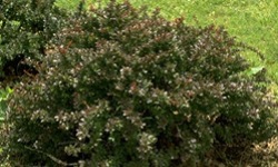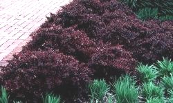 Osiąga zaledwie 1 m wysokości. Liście brązowo czerwone, jesienią