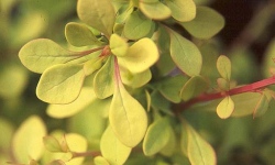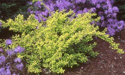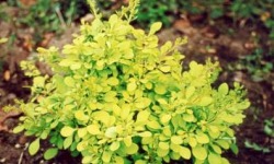 Krzew wysokości do 1m o szerokim, regularnym kulistym pokroju, gęsto ugałęziony. Krótkie pędy są łukowato wygięte. Młode liście cytrynowo-żółte i słabo zaczerwienione (na końcach pędów i na słońcu),
