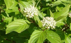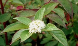 Dereń biały jest wysokim krzewem lub niskim drzewkiem. Liście ma
