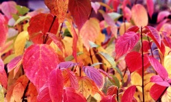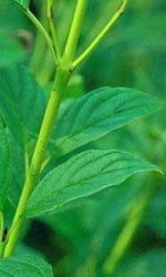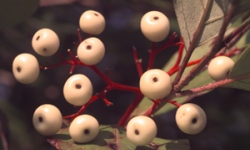 między intensywnymi barwami pędów tych krzewów. Krzew ten dorasta do 2 metrów wysokości, szeroko się rozgałęziając.