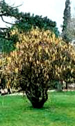 Duży, gęsty krzew z parasolowatą koroną. Gałęzie ma mocno skręcone