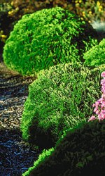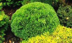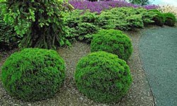 Karłowy, kulisty krzew, osiągający w wieku 10 lat 0,4m średnicy. Ma